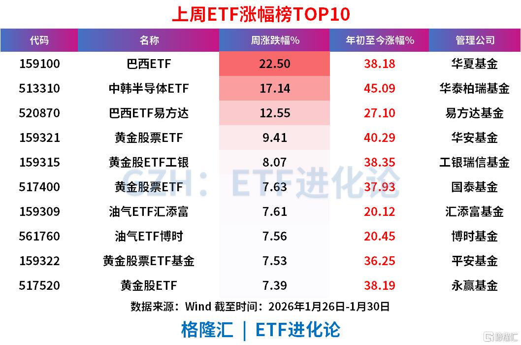 巴西ETF、中韩半导体ETF、巴西ETF易方达、黄金股票ETF、黄金股ETF工银、黄金股票ETF、油气ETF汇添富上周分别涨22.50%、17.14%、12.55%、9.41%、8.07%、7.63%、7.61%。