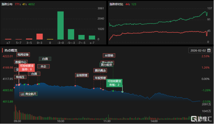 2月2日,沪深两市成交额2.58万亿,较上一个交易日缩量2508亿。板块方面,贵金属、有色金属板块现跌停潮,半导体、汽车、存储芯片等板块下挫;电网设备、白酒等板块涨幅居前。