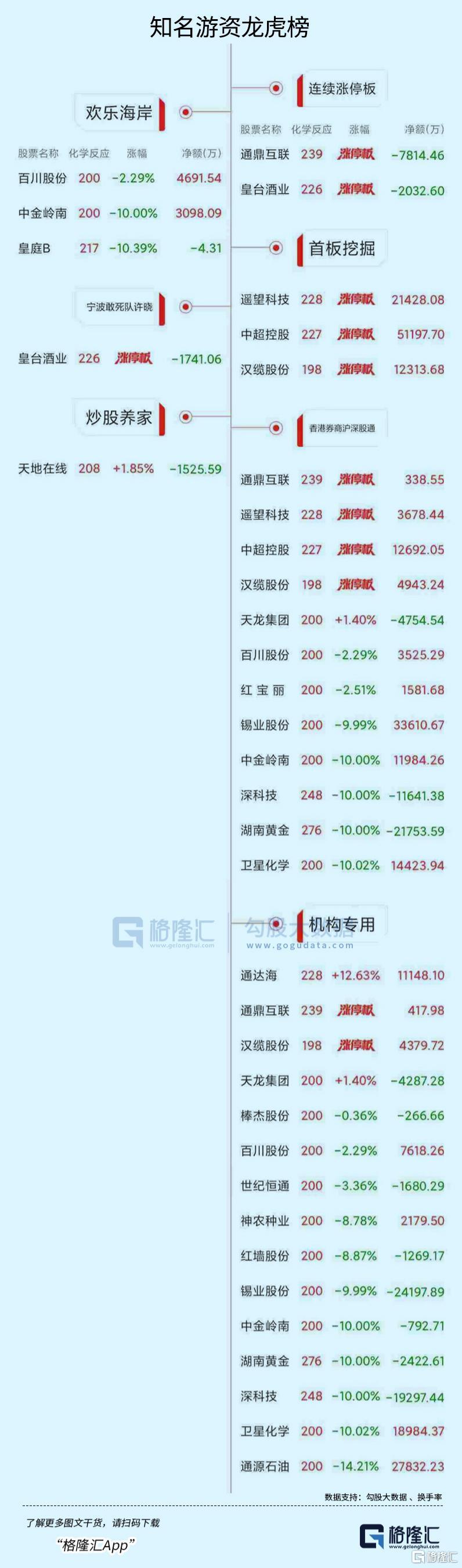 龙虎榜中涉及机构专用席位的个股中,当日净买入额前三为通源石油、通光线缆、卫星化学,分别为2.16亿元、1.15亿元、9816.48万元。