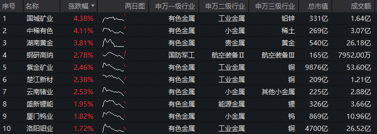 成份股方面,国城矿业、中稀有色领涨超4%,湖南黄金涨逾3%,钢研高纳、紫金矿业、楚江新材等个股跟涨。权重股方面,紫金矿业涨超2%,洛阳钼业涨逾1%。