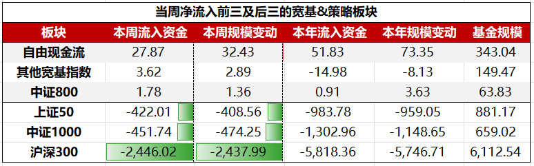 具体到细分板块,宽基&策略板块ETF中,净流入前三大板块依次为:自由现金流、其他宽基指数、中证800;净流出前三大板块依次为:沪深300、中证1000、上证50。