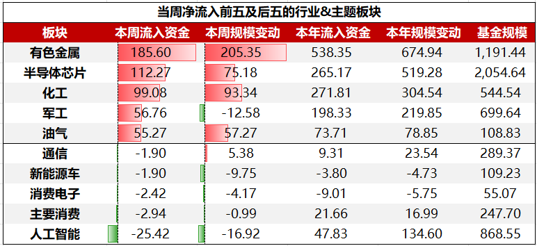 行业&主题板块ETF中,净流入前五大板块依次为:有色金属、半导体芯片、化工、军工、油气;净流出前五大板块依次为:人工智能、主要消费、消费电子、新能源车、通信。