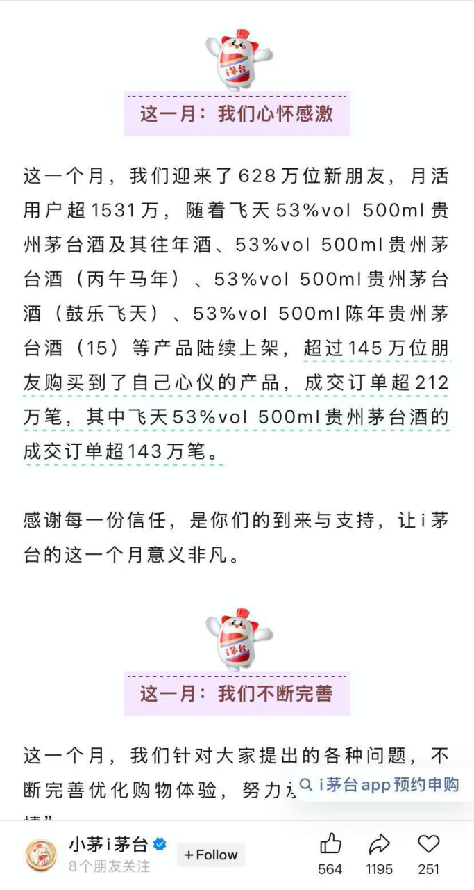 i茅台指出,“这一个月,我们迎来了628万位新朋友,月活用户超1531万,随着飞天53%vol 500ml贵州茅台酒及其往年酒、53%vol 500ml贵州茅台酒(丙午马年)、53%vol 500ml贵州茅台酒(鼓乐飞天)、53%vol 500ml陈年贵州茅台酒(15)等产品陆续上架,超过145万位朋友购买到了自己心仪的产品,成交订单超212万笔,其中飞天53%vol 500ml贵州茅台酒的成交订单超143万笔。”