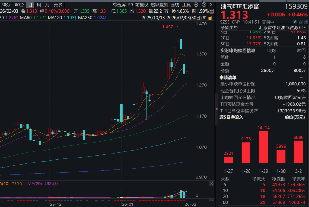 今日(2.3),油气板块再度活跃,油气ETF汇添富(159309)冲高回落现涨0.46%,成交额快速突破3000万元!资金持续流入,连续15日“吸金”5.54亿元,今日盘中再获净流入2300万元!