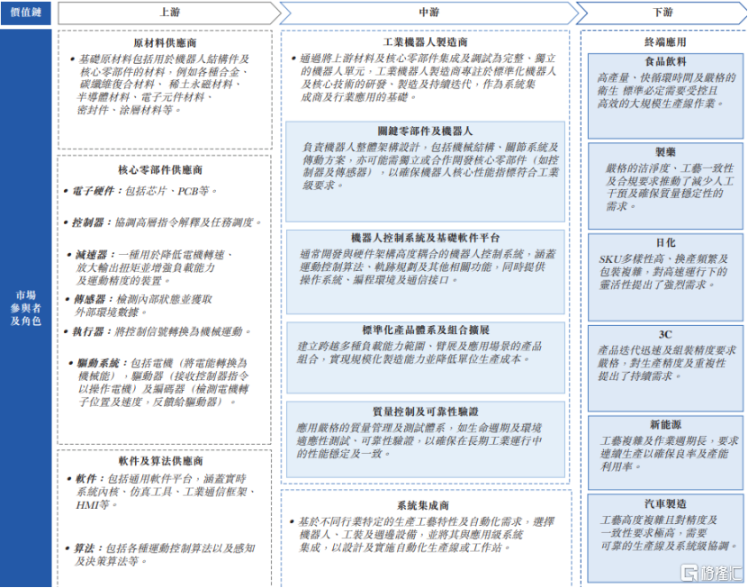 工业机器人行业上游为基础材料、核心零部件及软件供应商,参与企业包括拓普集团、三花智控、绿的谐波、双环传动、中大力德、汇川技术、固高科技等。