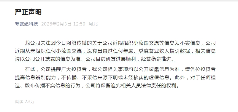 2月3日午间停盘阶段,寒武纪突然发布声明,回应网络传播的关于近期组织小范围交流等信息。寒武纪表示公司近期从未组织任何小范围交流,没有出具过任何年度、季度营业收入指引数据,相关信息请以公司公开披露的信息为准。公司目前研发进展顺利,经营稳步推进。