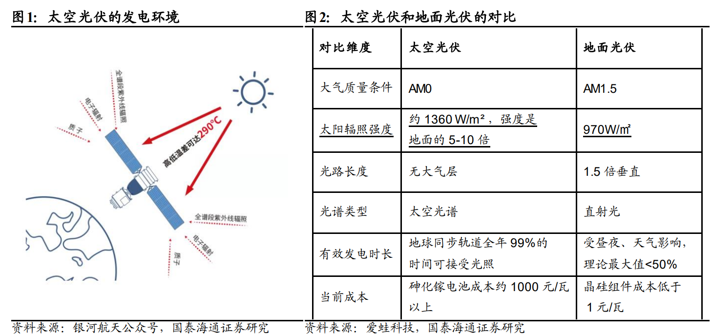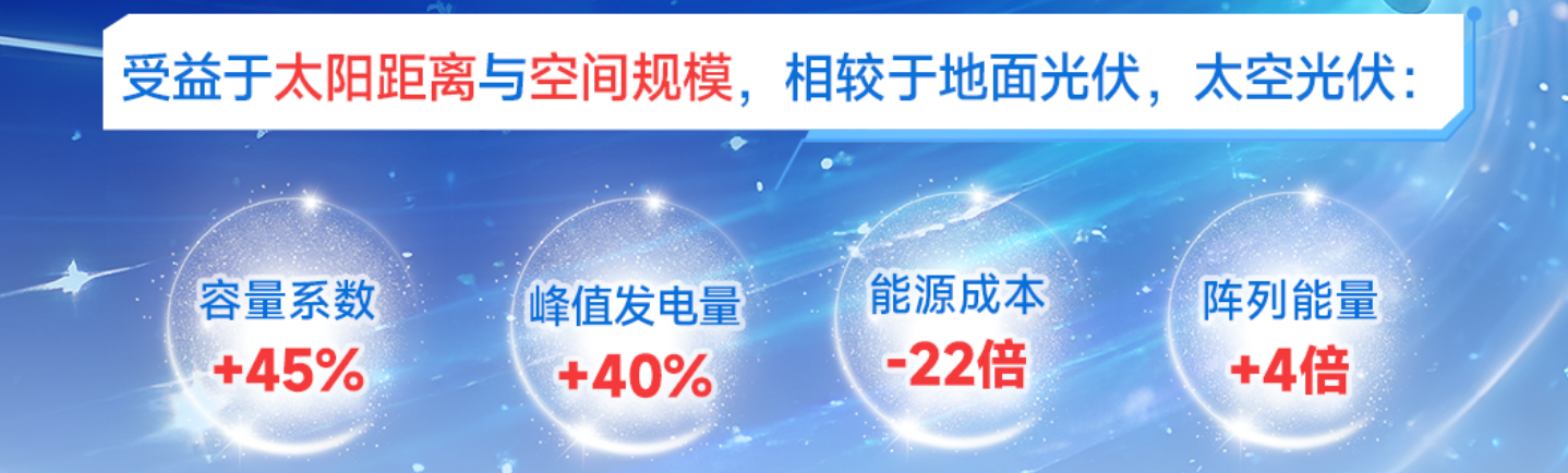 与地面受昼夜交替、天气变化、大气衰减等瓶颈制约相比,在太空中、尤其是在地球同步轨道,太阳能电池可以24小时不间断吸收阳光、没有大气层的遮挡,年发电小时数和能量密度相较地面光伏可提升数倍。