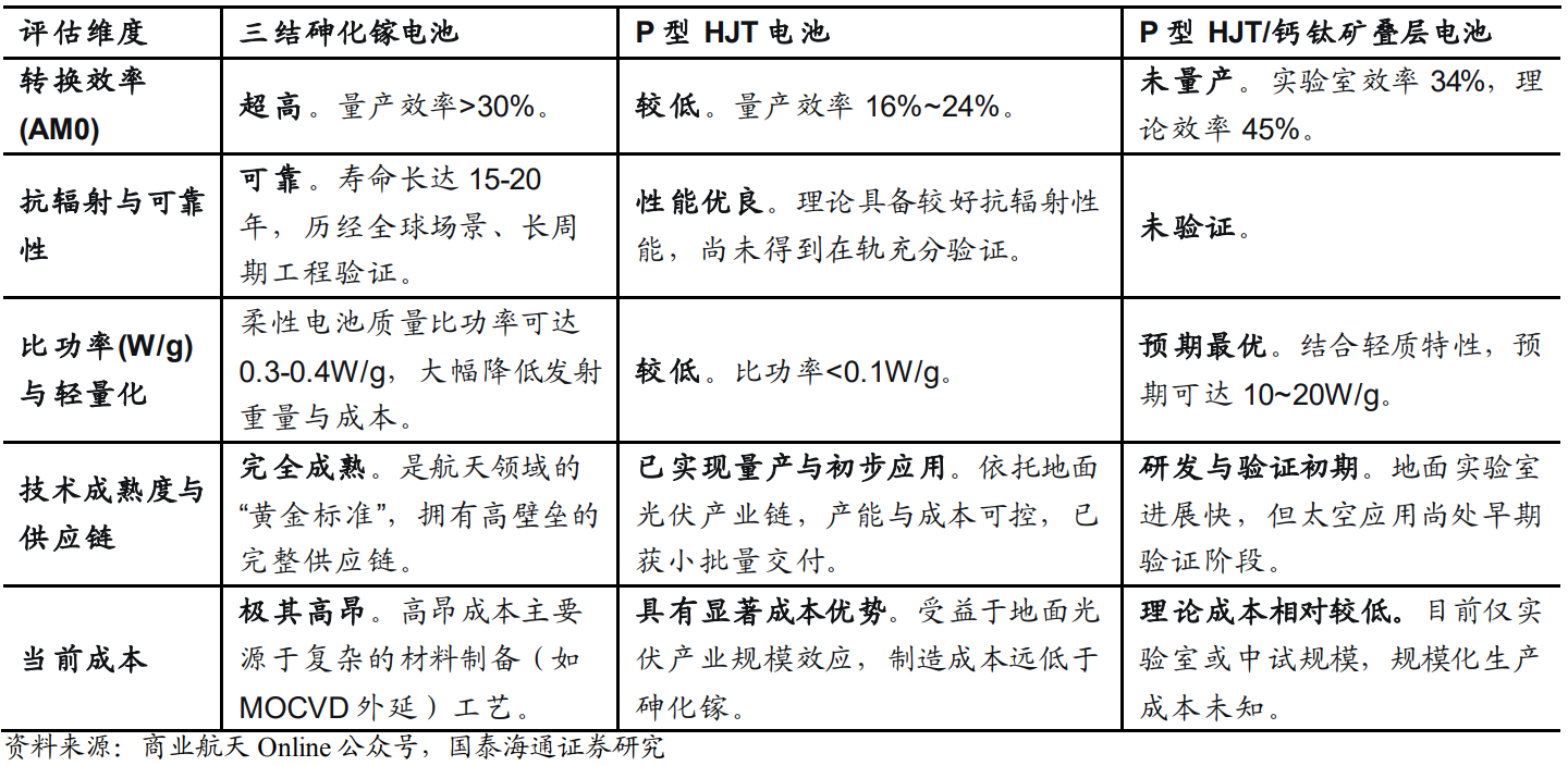 总的来说,太空光伏的技术路线有望从砷化镓向P型HJT、钙钛矿叠层电池迭代。