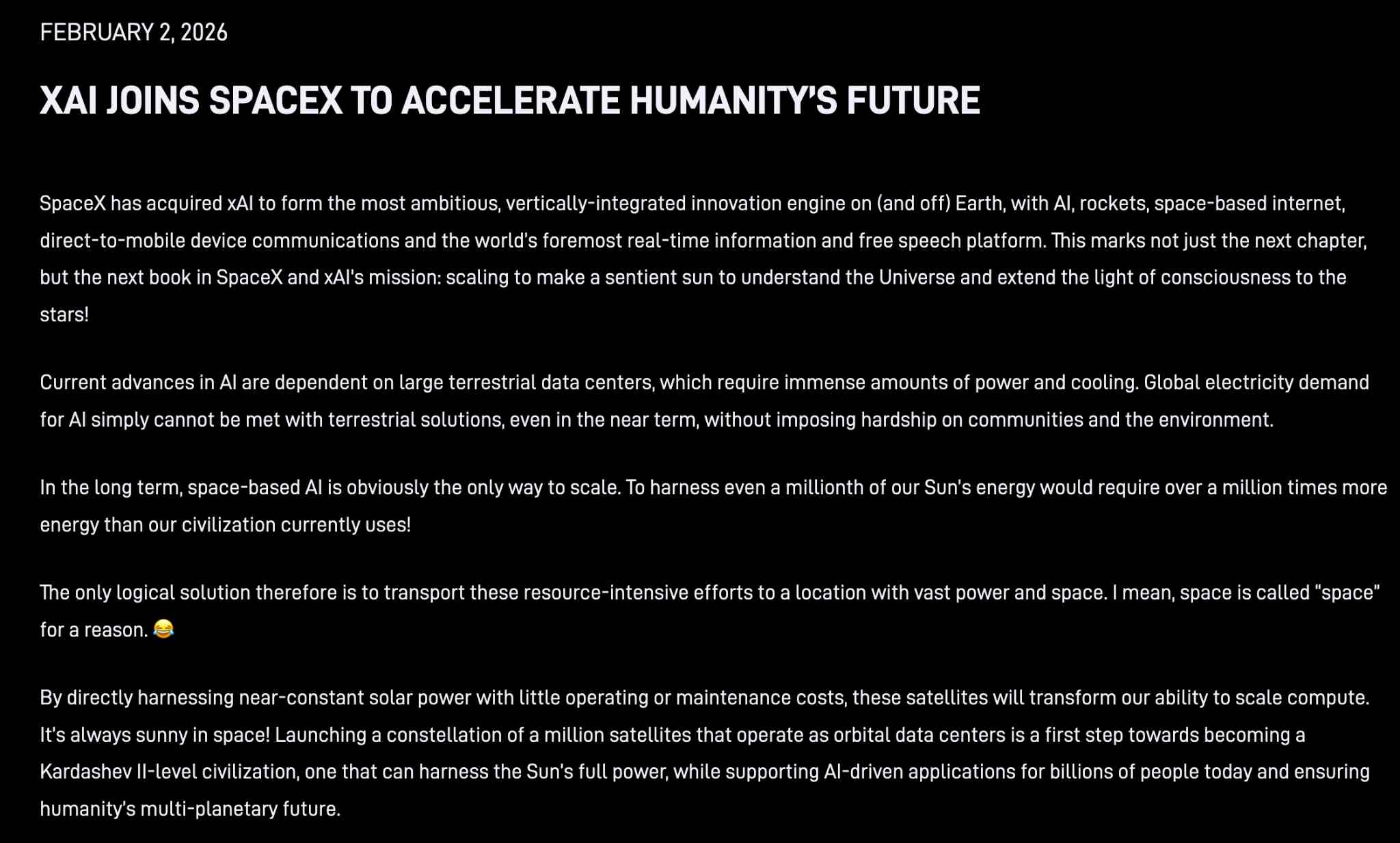 马斯克公开表示,此次合并可让SpaceX计划利用其卫星网络(Starlink)与未来部署的轨道数据中心为xAI提供强大的算力支持,这有望应对地面AI数据中心日益增长的能源和冷却成本压力。