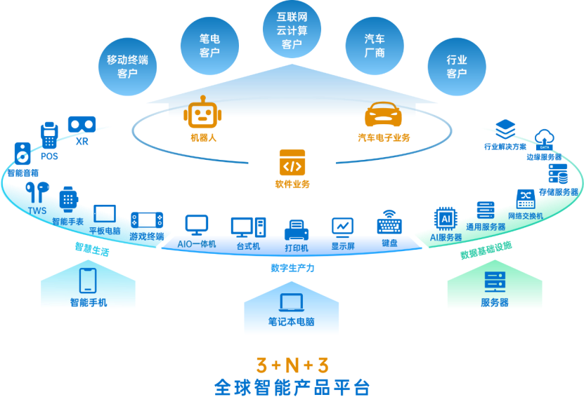 系统集成能力使华勤的延展性极强,这个优势在服务器和汽车电子等复杂领域更为重要。根据公开资料,公司践行的“3 N 3”战略以智能手机、笔记本电脑、服务器为三大基座,拓展N种生态产品,如智能生活、商业数字生产力等,并布局汽车电子、软件、机器人三大创新方向。而AI带来的增量,正沿着从B端到C端、从算力基础设施到智能终端的路径,在华勤的“3 N 3”业务版图上逐层兑现。