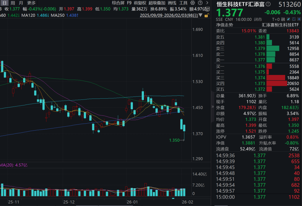 今日(2.3),受消息面刺激,港股科技再度飘绿,100%纯度的港股通科技ETF汇添富(520980)探底回升收跌0.45%,连续第四日回调,全天成交额大增至近6亿元!资金昨日再度涌入,今日收盘溢价率达0.65%,或反映资金逢跌布局意愿!