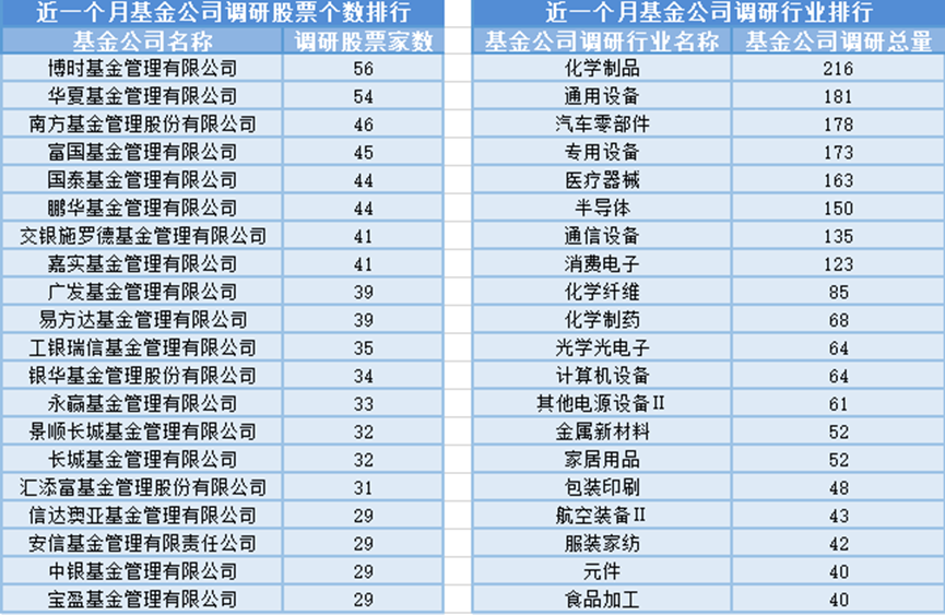 近一个月(1月4日-2月3日),博时基金参与公司调研的数量最多,共调研56家上市公司,此外调研较为活跃的还有华夏基金、南方基金和富国基金,分别调研54家、46家、45家上市公司;从调研行业上来看,基金公司对化学制品行业的上市公司调研次数最多,共有216次,其次是通用设备行业,基金公司调研了181次。