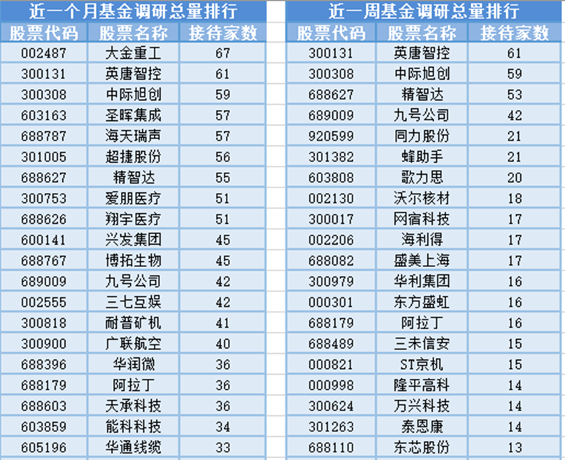 从个股调研情况上来看,最近1个月(1月4日-2月3日)最受公募基金关注的是大金重工,大金重工属于金属制品行业,主营业务为生产销售海上风电单桩基础、过渡段、导管架、浮式基础以及塔筒产品,为客户提供海上风电装备的“建造 运输 交付”一站式综合解决方案,可满足全球不同地区海上风电项目的多样化需求。共有67家基金管理公司参与调研,其次是英唐智控和中际旭创,分别接受61家、59家基金管理公司的调研。