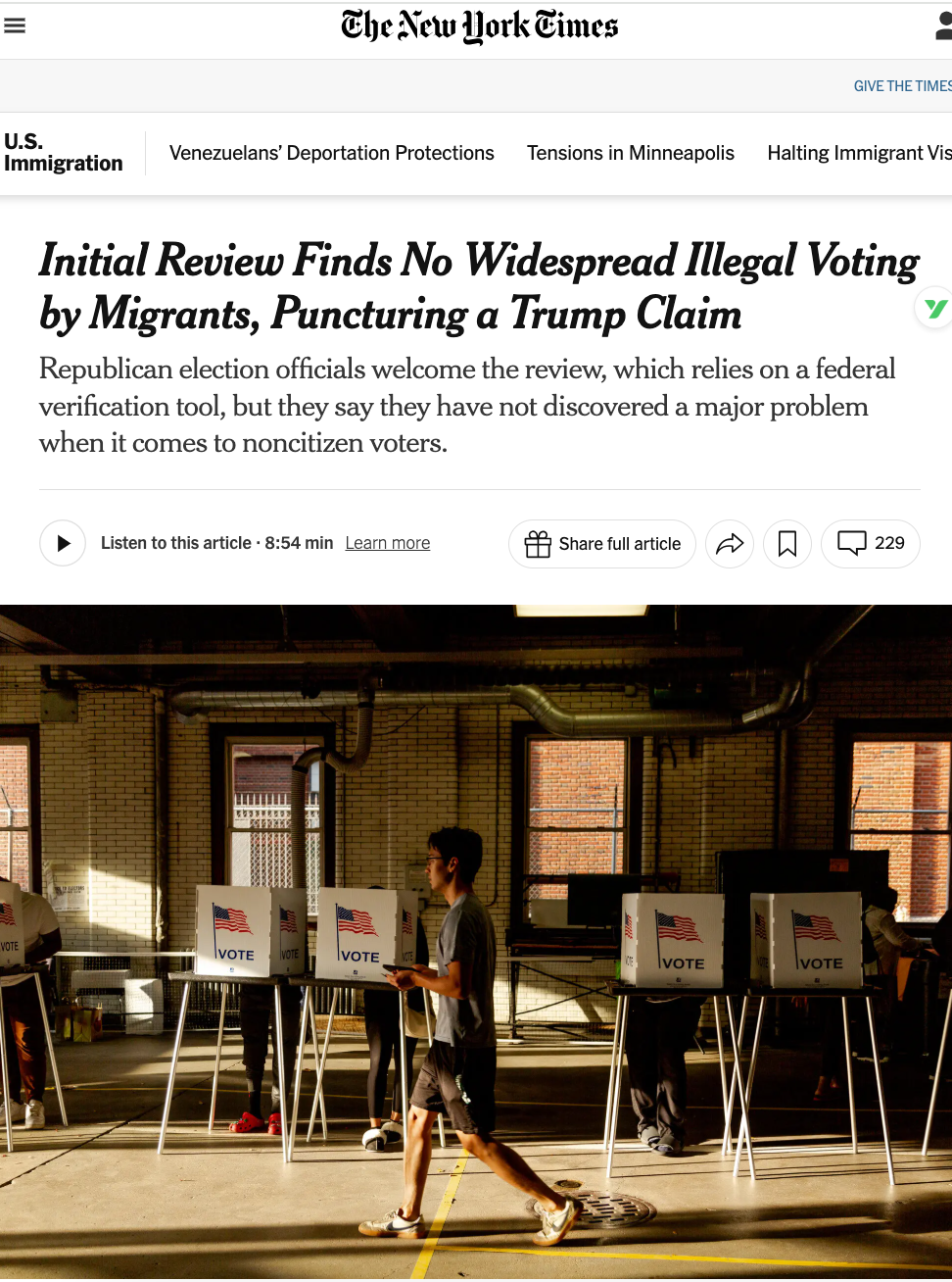 《纽约时报》今年1月14日报道,川普政府一个核查选民册的项目,初步审查未发现大规模非法移民投票现象,戳穿川普指控