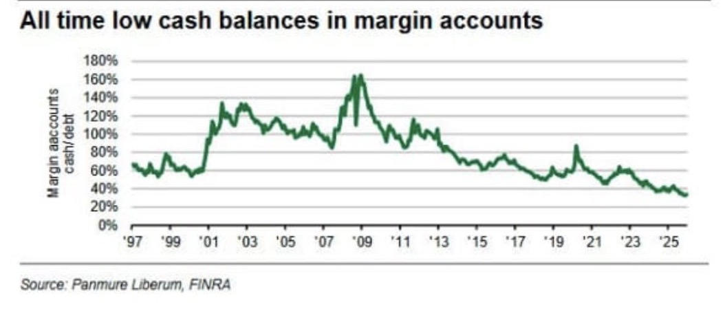 他提供的图表显示,美国保证金账户中现金余额与杠杆债务的比值处于历史最低水平。