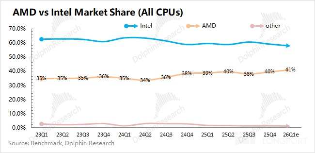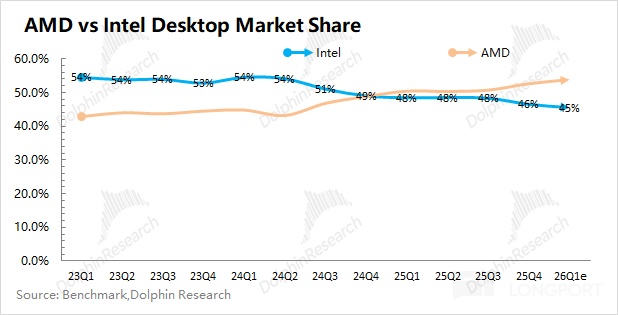 b)CPU 竞争力提升:AMD 持续在侵蚀英特尔在 CPU 领域的份额。