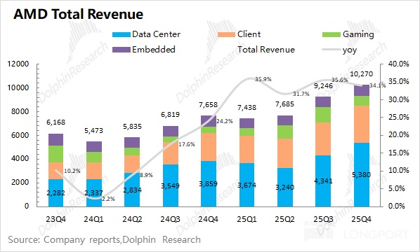 1、整体业绩:AMD 在 2025 年第四季度实现营收 102.7 亿美元,同比增长 34.1%,好于上调后的市场预期(100 亿美元)。在近期服务器 CPU 回暖的带动下,市场主流机构已经对公司的预期进行上调。本季度收入端的增长,也主要得益于数据中心 CPU、客户端业务的带动。