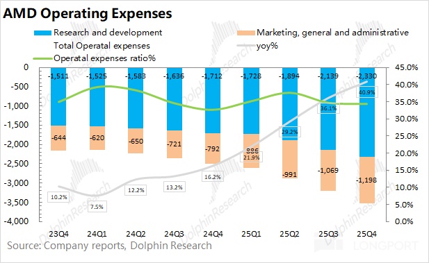 AMD 在 2025 年第四季度的经营费用为 35.3 亿美元,同比增长 41%。其中研发费用和销售及管理费用都有不同幅度的增加。