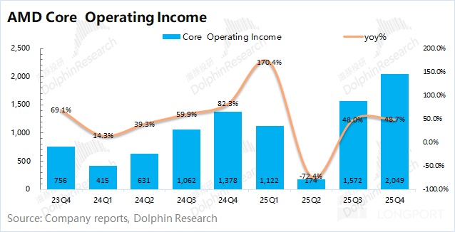 在剔除收购费用等影响后,海豚君测算 AMD 本季度的核心经营利润为 20.5 亿美元,继续回升。本季度公司受 MI308 库存销售的影响(对毛利约 3.6 亿增厚),如剔除该影响,公司本季度核心经营利润仍有提升,受益于服务器 CPU 回暖的带动。