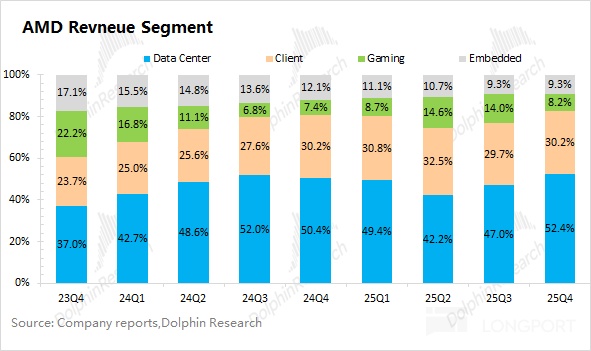 AMD 的客户端业务在 2025 年第四季度实现收入 31 亿美元,同比增长 34%,好于市场预期(29 亿美元)。客户端业务的增长,主要得益于 PC 市场回暖以及对英特尔份额的侵蚀。