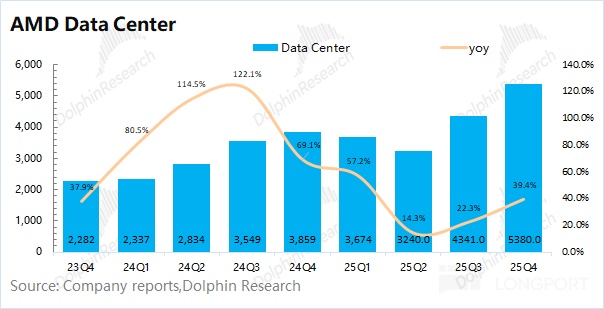 AMD 的数据中心业务在 2025 年第四季度实现收入 53.8 亿美元,同比增长 39%,达到市场上调后的预期(53 亿美元左右)本季度的同比增长,主要服务器 CPU 出货增长和 MI308 的再次销售。