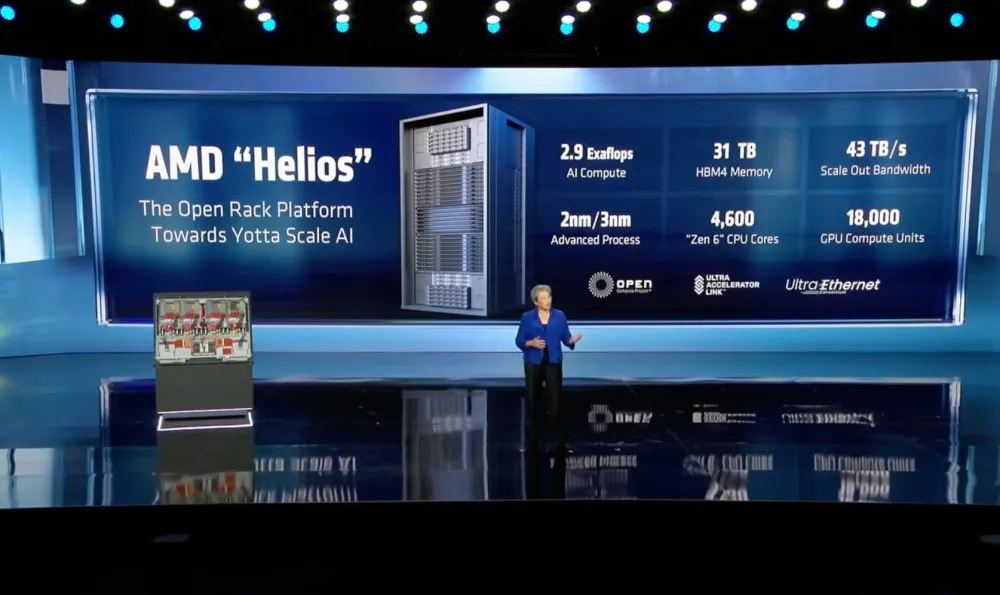 Helios 机架将支持最多 72 块 MI455X GPU,通过 “43TB/s 横向扩展带宽”(超以太网技术)和 “全液冷设计”,实现跨 GPU、跨机架的高效协同,单机架 AI 算力达 2.9ExaFLOPS(FP4)。