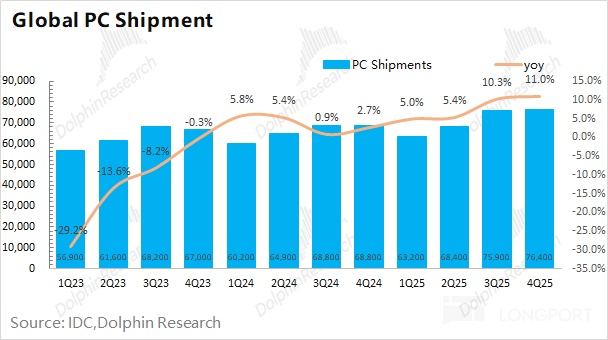结合行业数据看,2025 年第四季度全球 PC 出货量 7640 万台,同比增长 11%。与此同时,AMD 的客户端业务却能取得34% 的同比增长相比来看,英特尔的客户端业务同比仍下滑 6.6%