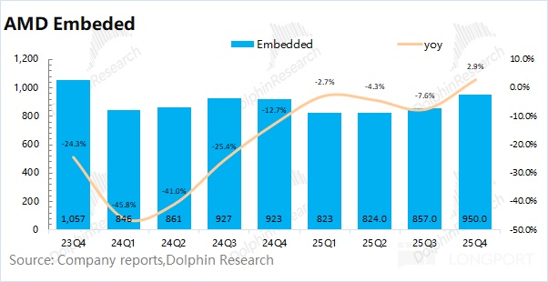 2)嵌入式业务:公司的嵌入式业务在 2025 年第四季度实现收入 9.5 亿美元,同比增长 3%,其中多个终端市场需求的回暖提供了支撑。