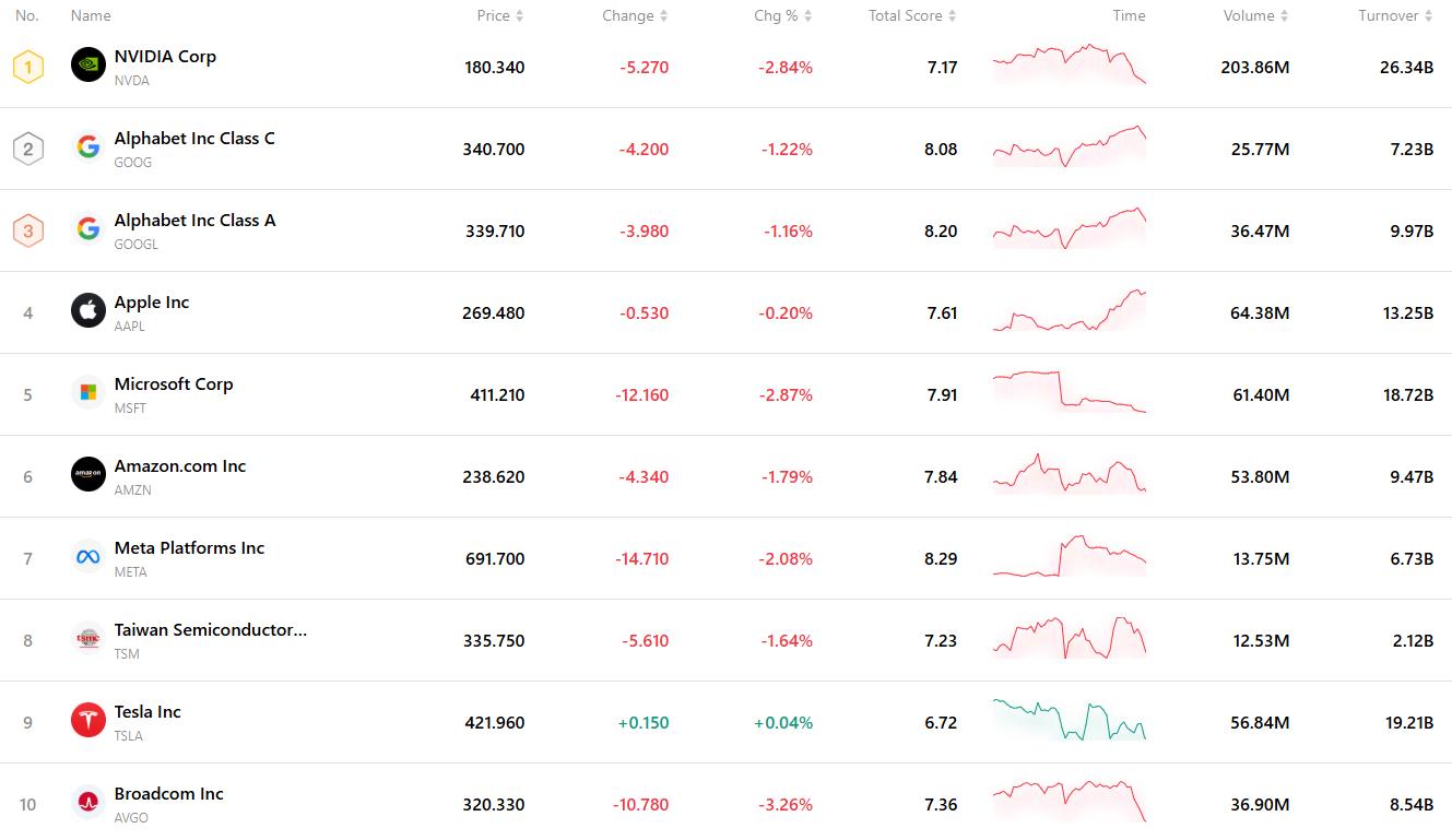 下图列出了当前市场上交易最活跃的十只股票。凭借巨大的成交量和极高的流动性,这些标的已成为追踪全球市场动态的关键基准。
