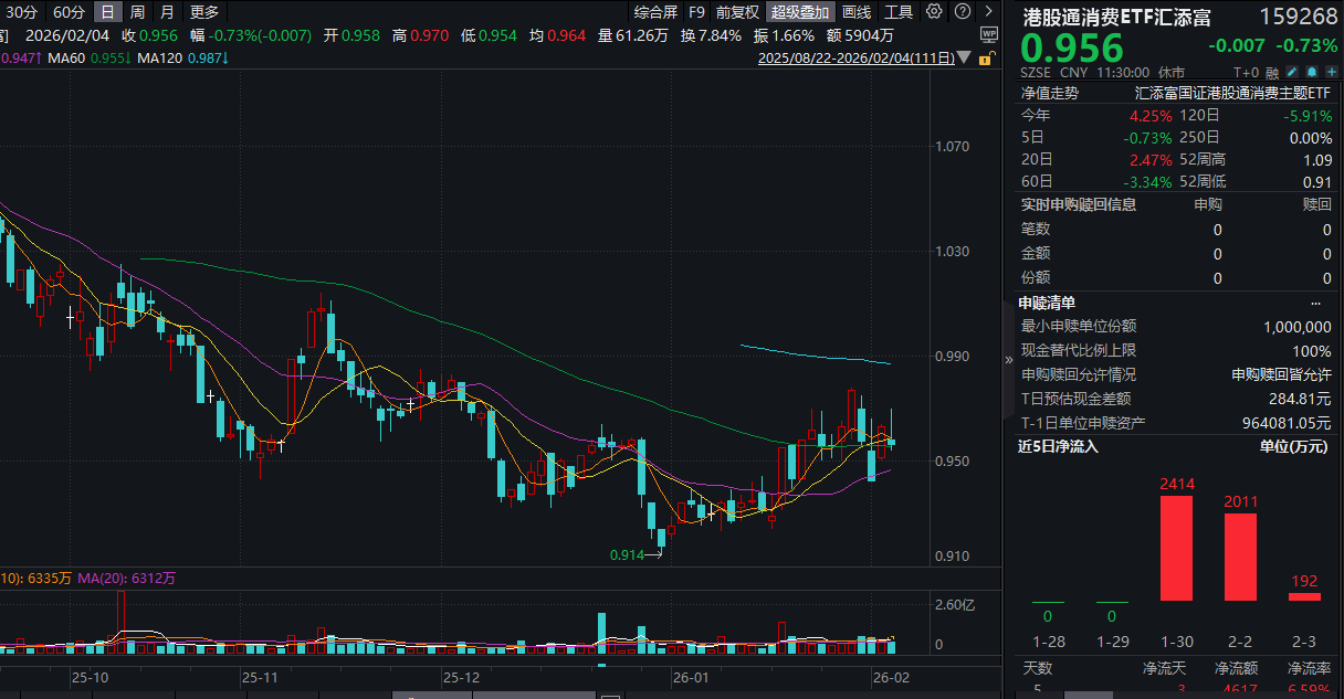 风险提示:基金有风险,投资需谨慎。投资人应当阅读《基金合同》《招募说明书》《产品资料概要》等法律文件,了解基金的风险收益特征,特别是特有风险,并根据自身投资目的、投资经验、资产状况等判断是否和自身风险承受能力相适应。基金管理人承诺以诚实信用、谨慎尽责的原则管理和运用基金资产,但不保证基金一定盈利或本金不受损失。上述产品均属于中等风险等级(R3)产品,适合经客户风险等级测评后结果为平衡型(C3)及以上的投资者。文中提及个股仅为指数成份股客观展示列举,本文出现信息只作为参考,投资人须对任何自主决定的投资行为负责。本文中的任何观点、分析及预测不构成对阅读者任何形式的投资建议。港股通消费ETF汇添富(159268)的基金投资范围包括港股,会面临因投资环境、投资标的、市场制度以及交易规则等差异带来的特有风险。投资者在申购/赎回ETF基金份额时,申购赎回代理券商可按照不超过0.50%的标准收取佣金,其中包含证券交易所、登记机构等收取的相关费用。其他基金的销售费用请参见相应基金的招募说明书、产品资料概要等法律文件。投资者在申购/赎回ETF基金份额时,申购赎回代理券商可按照不超过0.50%的标准收取佣金,其中包含证券交易所、登记机构等收取的相关费用。其他基金的销售费用请参见相应基金的招募说明书、产品资料概要等法律文件。
