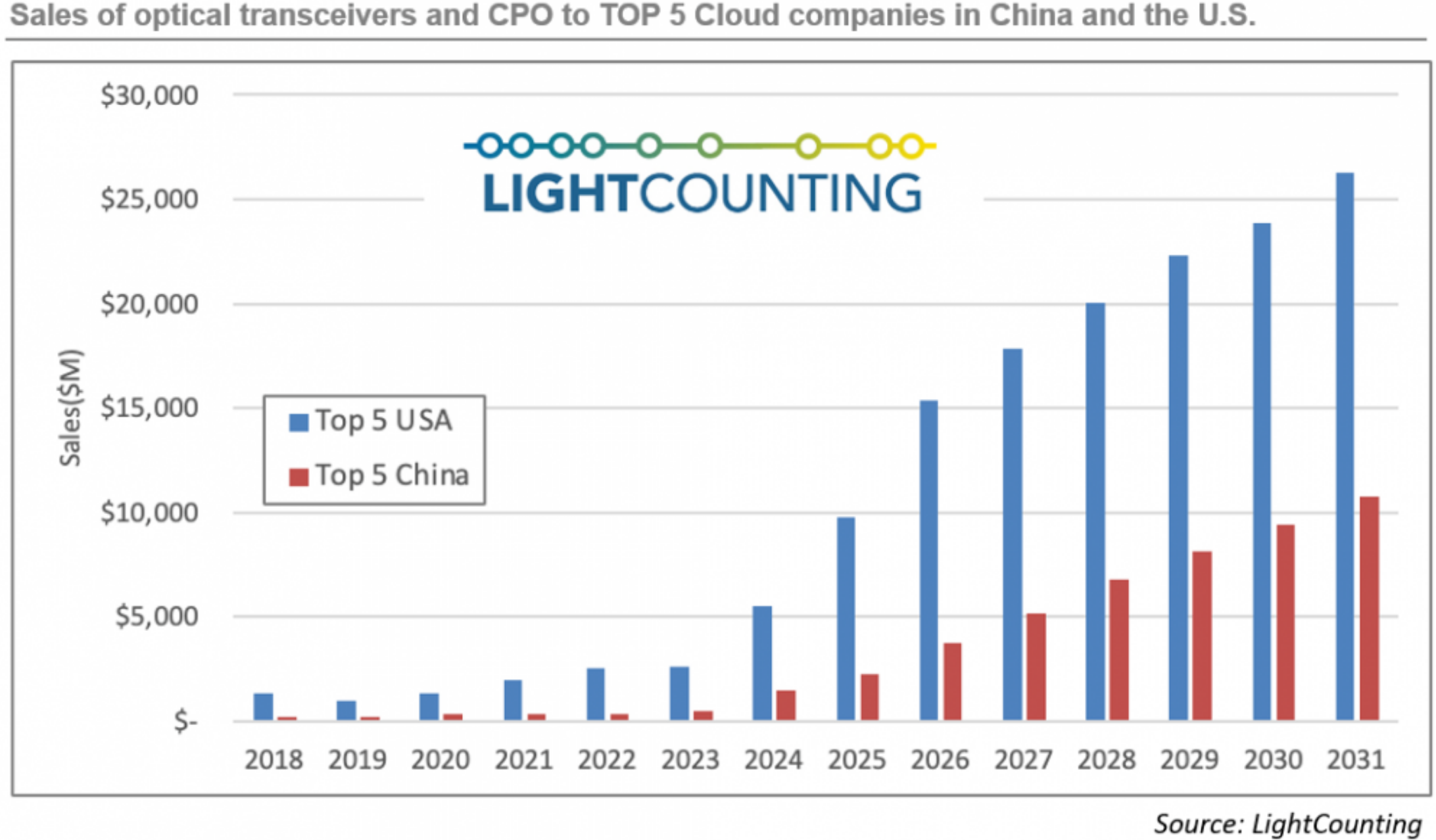 另一方面,根据LightCounting对中美前五大云服务商的以太网光模块及CPO/NPO采购额估算,中美之间的差距正快速缩小:从2022年的7倍,降至2024年-2025年的4倍,预计到2031年将进一步缩小至2.5倍。