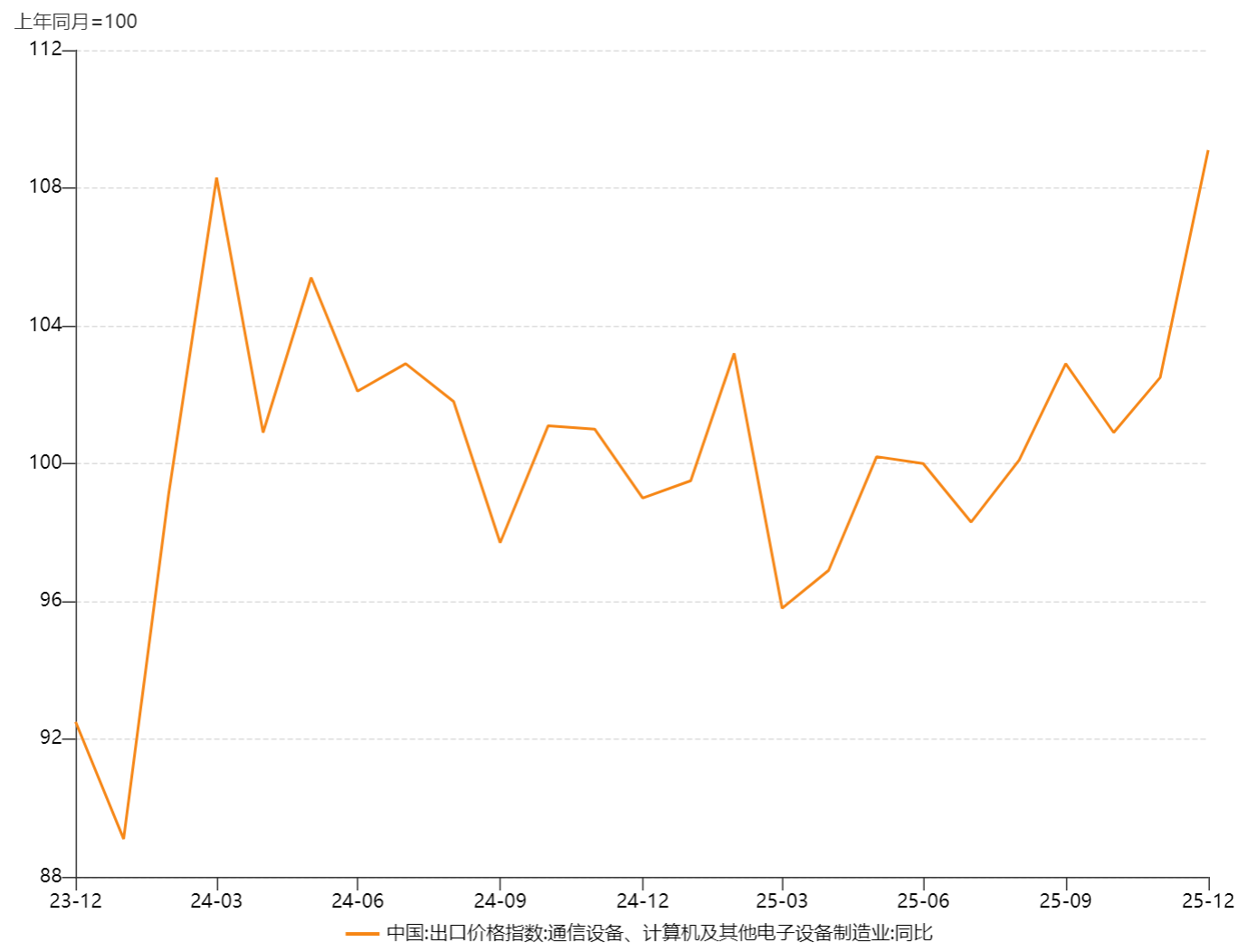 图片趋势描述:从趋势观察,由于AI算力需求爆发推动服务器、高速光模块等高端产品出口占比提升,通信设备、计算机及其他电子设备出口价格同比上升趋势明显