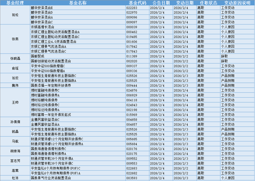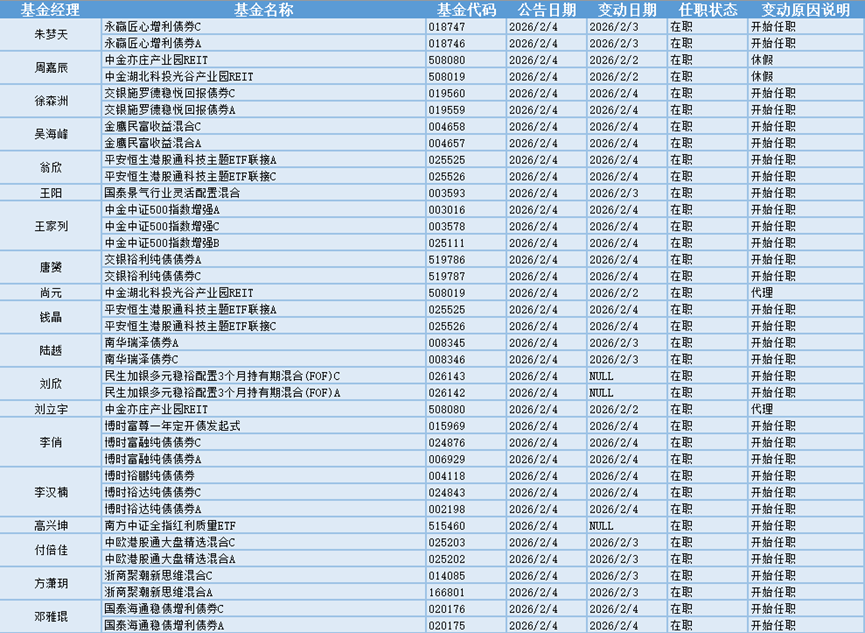 基金经理是一只基金产品最核心的成员,能决定一只基金的投资方向、投资策略以及投资风格,基金经理出色的择时选股能力和调研预测能力是基金业绩的有力保证,所以基金经理是投资者在选择基金产品时的重要参考依据。基金经理的变动很大程度上会影响到基金产品未来的表现,是一个需要特别关注的信息。2月4日共有35位基金经理发生任职变动。