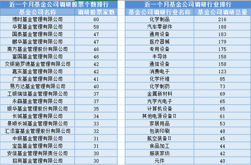 近一个月(1月5日-2月4日),博时基金参与公司调研的数量最多,共调研60家上市公司,此外调研较为活跃的还有华夏基金、国泰基金和鹏华基金,分别调研58家、47家、47家上市公司;从调研行业上来看,基金公司对化学制品行业的上市公司调研次数最多,共有216次,其次是汽车零部件行业,基金公司调研了188次。