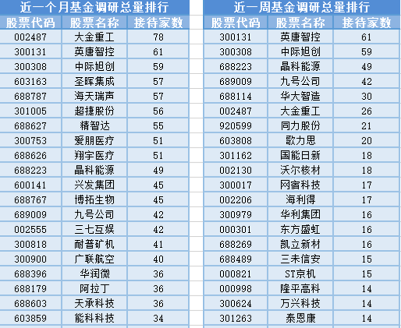 从个股调研情况上来看,最近1个月(1月5日-2月4日)最受公募基金关注的是大金重工,大金重工属于金属制品行业,主营业务为生产销售海上风电单桩基础、过渡段、导管架、浮式基础以及塔筒产品,为客户提供海上风电装备的“建造 运输 交付”一站式综合解决方案,可满足全球不同地区海上风电项目的多样化需求。共有78家基金管理公司参与调研,其次是英唐智控和中际旭创,分别接受61家、59家基金管理公司的调研。