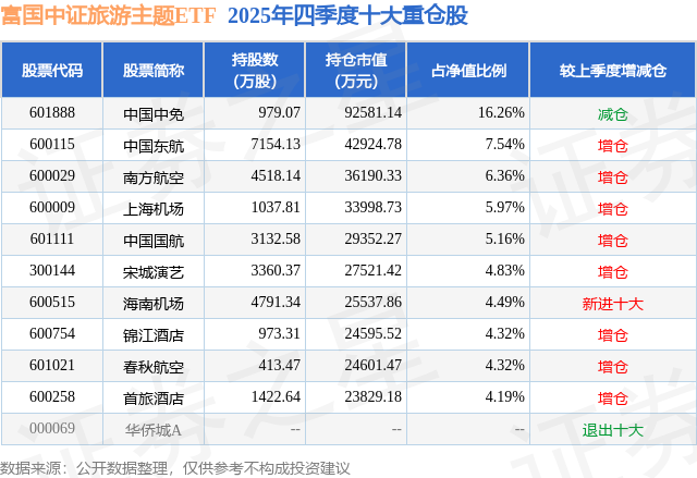 根据2025基金年报公募基金重仓股数据,重仓该股的公募基金共97家,其中持有数量最多的公募基金为富国基金的富国中证旅游主题ETF。富国中证旅游主题ETF目前规模为56.94亿元,最新净值0.7999(2月3日),较上一交易日上涨1.64%,近一年上涨19.93%。该公募基金现任基金经理为曹璐迪 殷钦怡。曹璐迪在任的基金产品包括:富国中证价值ETF联接A,管理时间为2020年5月20日至今,期间收益率为120.46%;富国中证价值ETF,管理时间为2020年5月20日至今,期间收益率为131.05%;富国创业板ETF,管理时间为2020年8月6日至今,期间收益率为15.87%;富国中证科创创业50ETF,管理时间为2021年6月29日至今,期间收益率为-3.85%。殷钦怡在任的基金产品包括:富国中证细分化工产业主题ETF发起式联接A,管理时间为2024年7月23日至今,期间收益率为55.22%;富国中证全指证券公司ETF,管理时间为2024年7月23日至今,期间收益率为46.91%;富国中证细分化工产业主题ETF,管理时间为2024年7月23日至今,期间收益率为60.13%;富国中证全指建筑材料ETF,管理时间为2024年7月23日至今,期间收益率为30.5%。