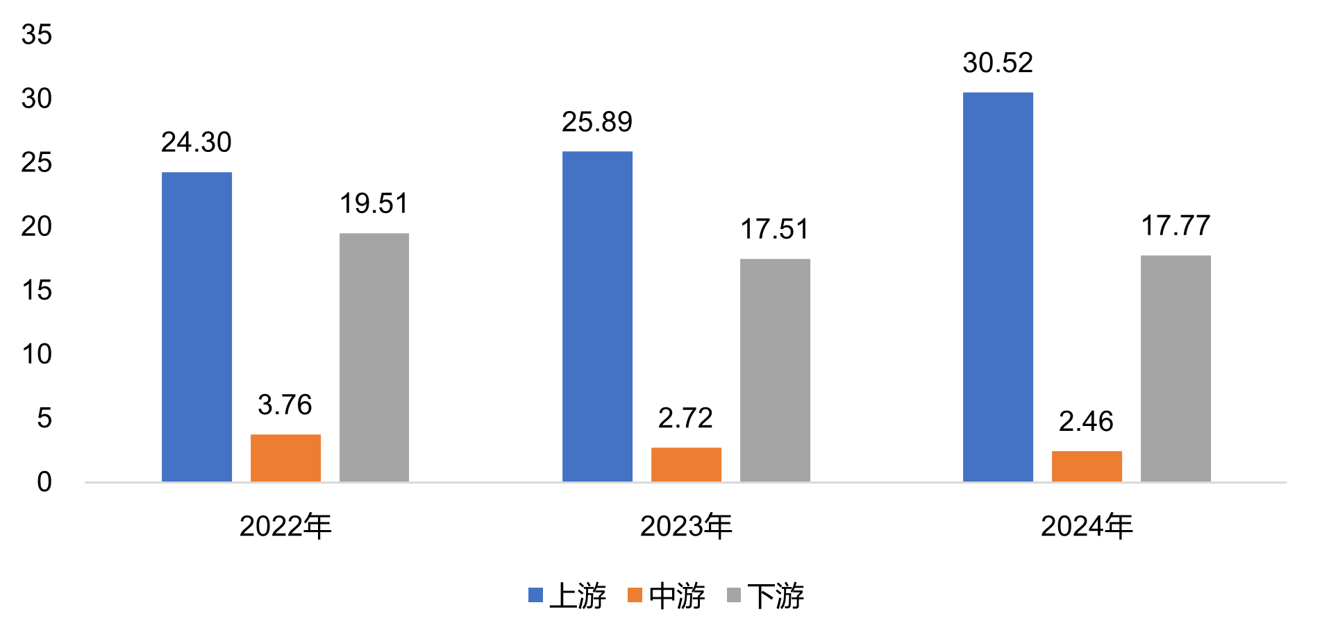 从产业链价值分配来看,上游矿企往往占据产业链利润高地,毛利率水平领先于中下游环节,呈现较为典型的“微笑曲线”特征。以黄金产业链中的A股上市公司为例,2022-2024年,上游环节平均毛利率达26.9%,略高于下游环节的18.3%,更是远超中游环节的3.0%,直观体现了上游环节的盈利优势。