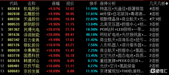 杭电股份、名雕股份4连板,天通股份4天3板,顺钠股份、民爆光电3连板,泽润新能、巨力索具、银轮股份、中集集团、国晟科技、韩建河山、双良节能、京投发展2连板。