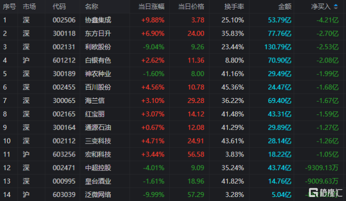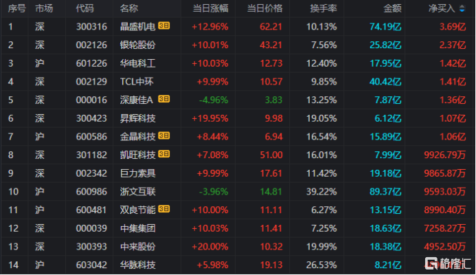 龙虎榜单日净买入额前三为银轮股份、华电科工、TCL中环,分别为2.37亿、1.42亿、1.41亿。