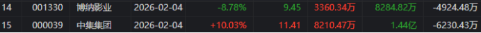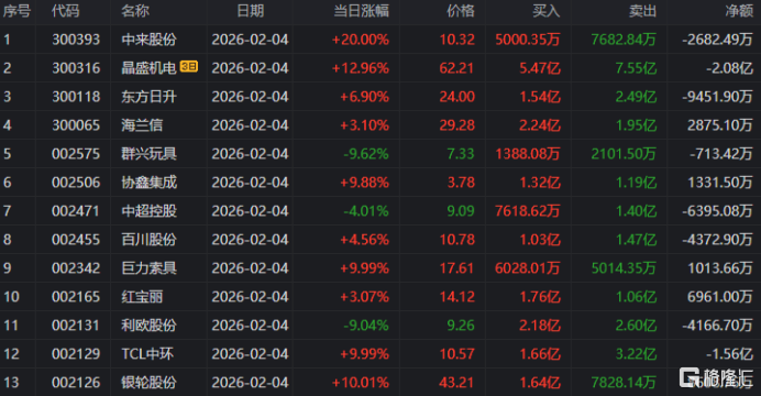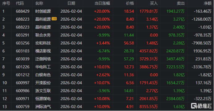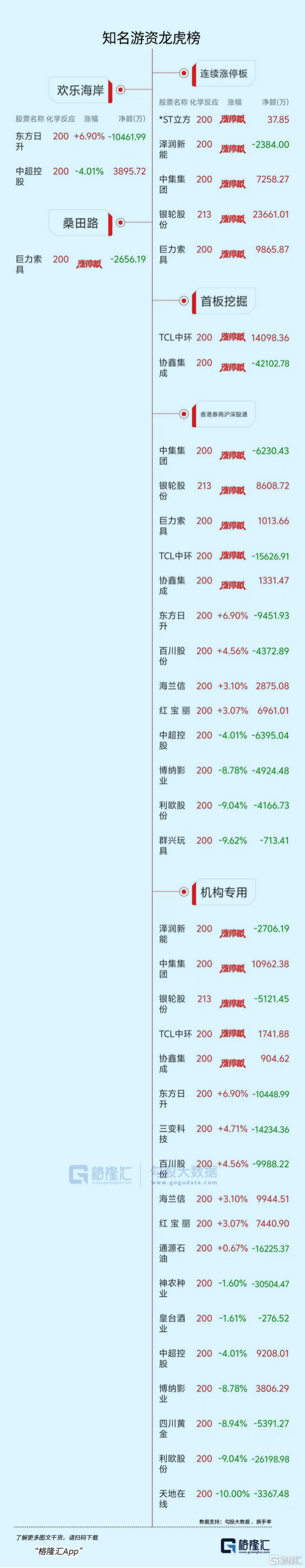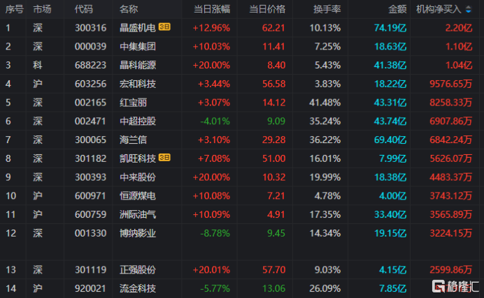 龙虎榜中涉及机构专用席位的个股中,单日净买入额前三为中集集团、晶科能源、宏和科技,分别为1.1亿、1.04亿、9576.65万。