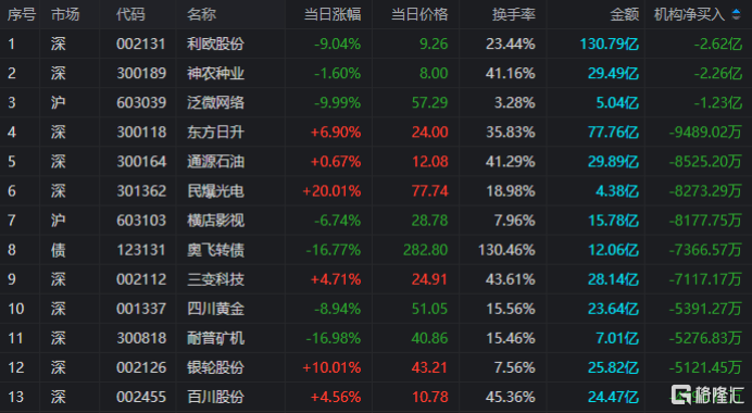 龙虎榜中涉及机构专用席位的个股中,单日净卖出额前三为利欧股份、神农种业、泛微网络,分别为2.62亿、2.26亿、1.23亿。