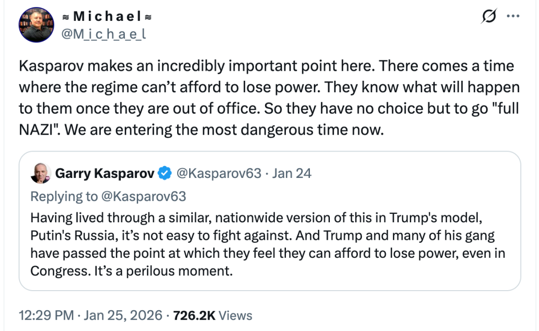 该推文说,当政权意识到自己已无力承受权力丧失的代价时,他们深知下台后的命运。于是别无选择,只能彻底“纳粹化”。我们正步入最危险的时期