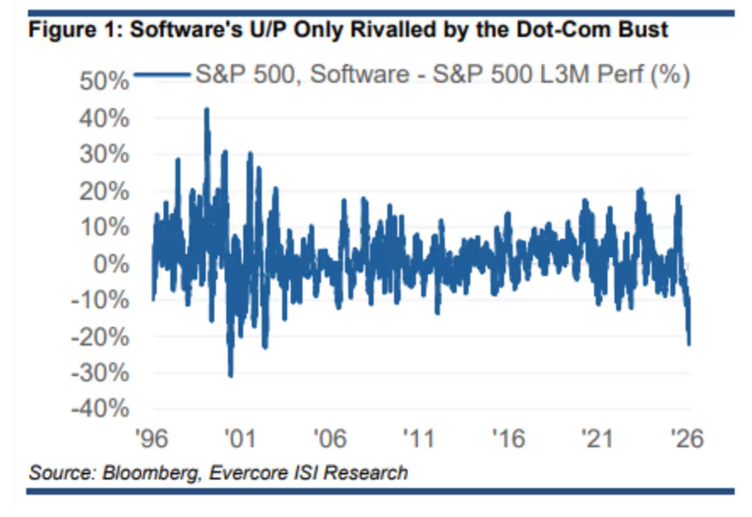 Evercore ISI的朱利安·伊曼纽尔及其团队指出,软件股所承受的压力仍在持续加大。他在周三发布的报告中表示,市场对人工智能将取代软件行业的担忧,使得板块近期相对于标普500指数的表现大幅落后,几乎仅次于当年的互联网泡沫破裂时期。