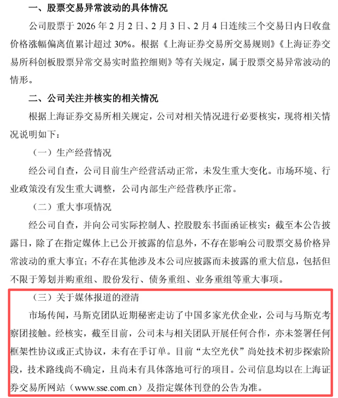 除晶科能源外,高测股份也于2月4日晚间发布公告,针对市场传闻作出澄清。高测股份表示,公司关注到有媒体报道称其与马斯克团队有过接触,该消息引发了市场广泛关注与讨论;经公司核查确认,目前公司尚未开展太空光伏相关业务,未与马斯克相关团队开展任何合作,未签署任何框架性协议或正式协议,也未产生相关订单和形成相关收入,上述传闻未对公司经营业绩造成影响。