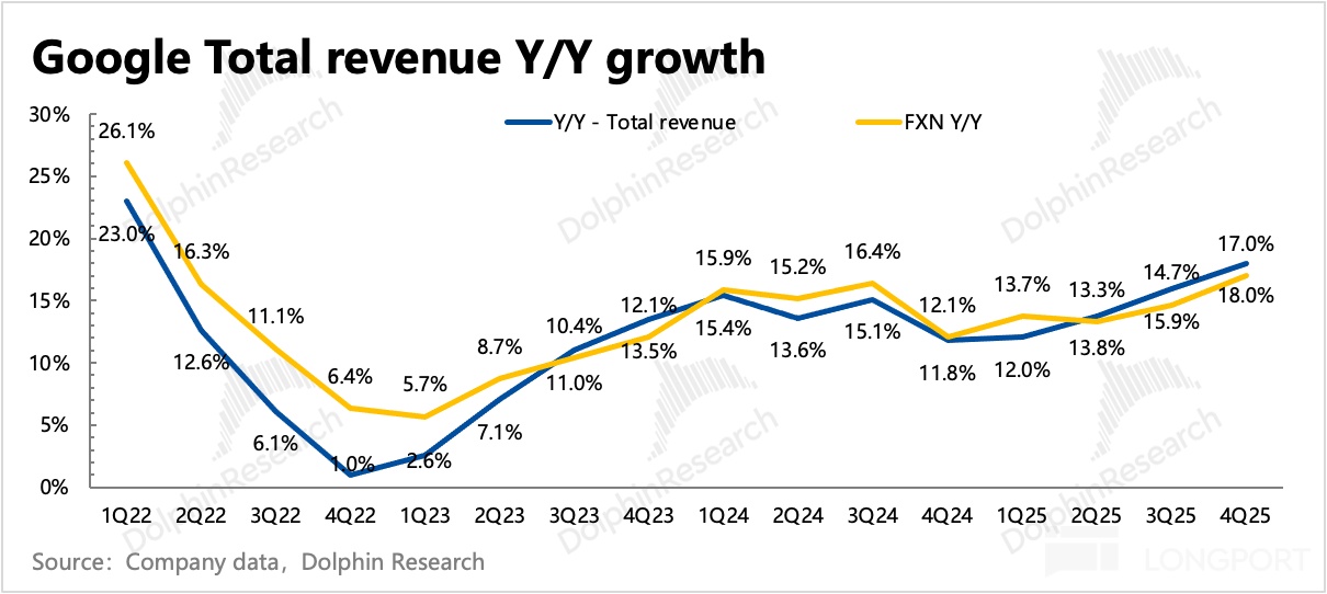 (1)搜索依旧很强劲:Q4 增长 16.7%,小超预期。去年四季度本身广告行业不错,电商、旅游广告表现突出,因为 AI 对广告转化效果的提升,广告主偏向线上效果广告。