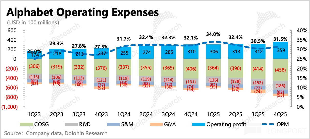 但从 Q3 开始,折旧费用就已经开始走高,同比 40% 的增长。预计随着 26 年天量 Capex 花出去,如果不做控制,总支出终究会飙涨。因此谷歌的人员调整还会继续,现在 Q4 净增员工数已经相较前三季度大大减少至 650 人。