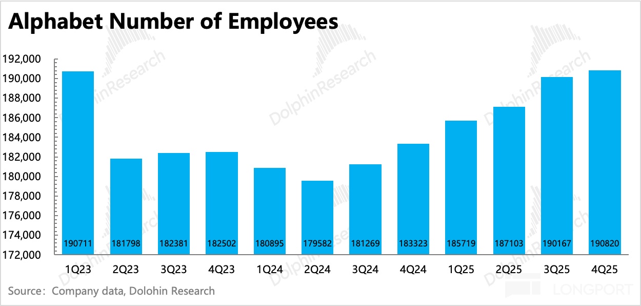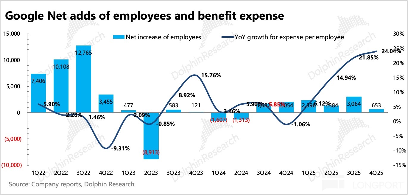 预计随着 26 年天量 Capex 花出去,如果不做控制,总支出马上会飙涨。因此谷歌的人员调整还会继续,现在 Q4 净增员工数已经相较前三季度大大减少至 650 人。