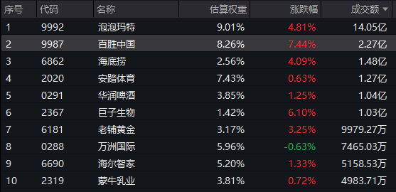 港股通消费ETF汇添富(159268)标的指数热门成分股中,百盛中国涨超7%,巨子生物涨超6%,泡泡玛特、海底捞涨超4%,老铺黄金涨超3%(标的指数成分股仅做展示,不作为个股推介)。
