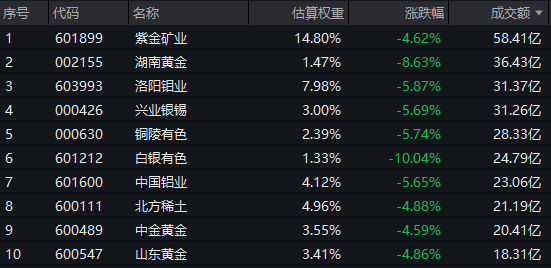 有色ETF汇添富(159652)标的指数热门成分股多数飘绿:白银有色跌停,湖南黄金跌超8%,洛阳钼业、兴业银锡、铜陵有色跌超5%,紫金矿业跌超4%。