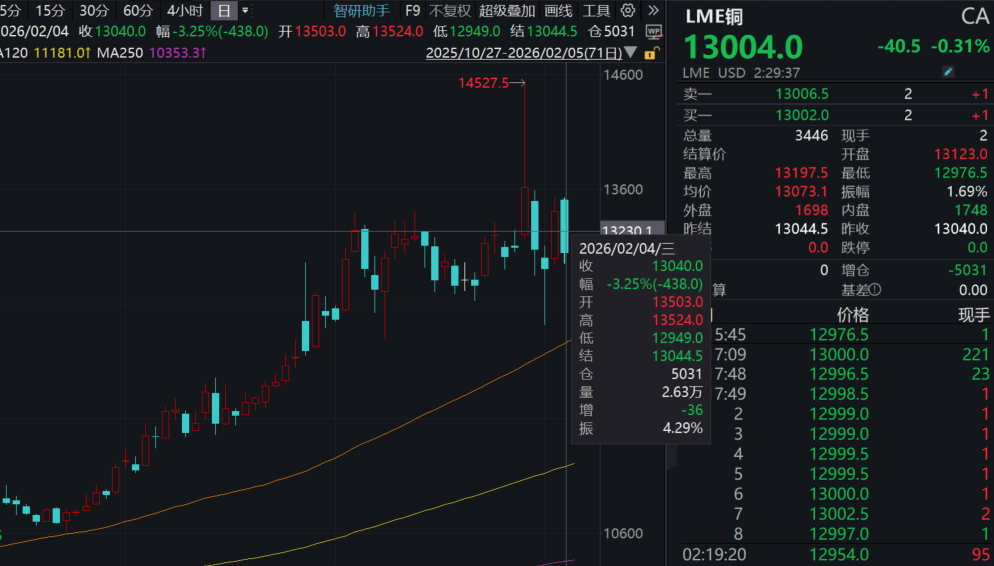 消息面上,2月5日早盘,现货黄金跳水回调,失守4950美元/盎司。COMEX期货黄金同步走低,跌破5000美元/盎司下方。铜价亦下跌,LME铜2月4日跌3.25%,2月5日日内亦延续回调。
